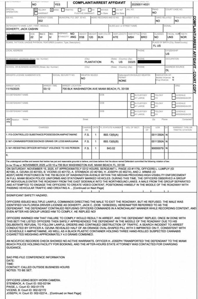 According to an arrest report, Miami Beach Police were conducting a high-visibility enforcement operation in the 700 block of Washington Avenue when officers noticed a group of people step into the street. One of them — later identified as Doherty — remained in the middle of the roadway while reportedly recording video content.